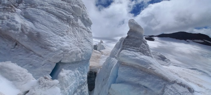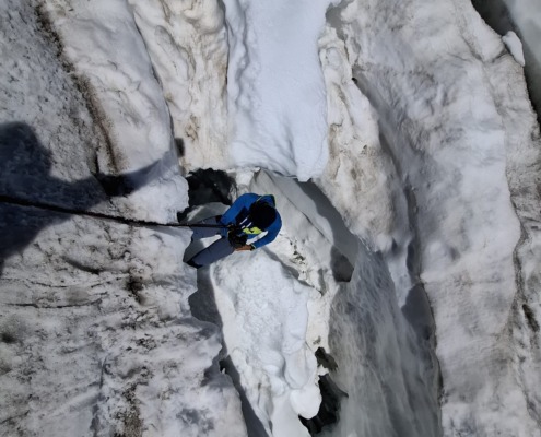 | 2. Tag | Aufstieg zum Gletscher (↑400 Hm, 1,5 h) Kursinhalt: Knotenkunde, Anseilen am Gletscher, Steigeisentechnik, Kameradenrettung, Selbstrettung, Gletscherkunde Abstieg zur Hütte (↓ 400 Hm, 1,5 h) |